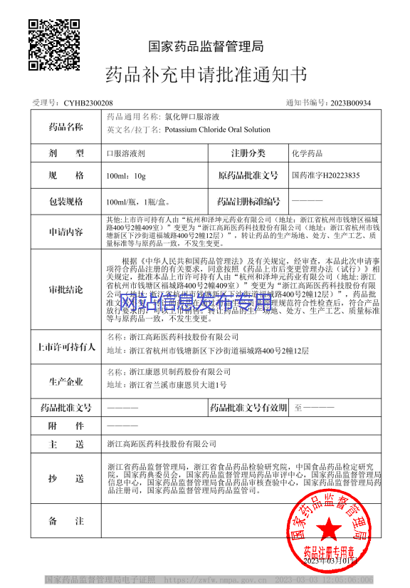 公司與浙江和澤醫(yī)藥科技股份有限公司達(dá)成轉(zhuǎn)讓協(xié)議的氯化鉀口服溶液(國藥準(zhǔn)字H20223835)于2023年03月01日取得補(bǔ)充申請批件。完成批文的轉(zhuǎn)讓。這是MAH公司生產(chǎn)藥品的第二個藥品批件。
